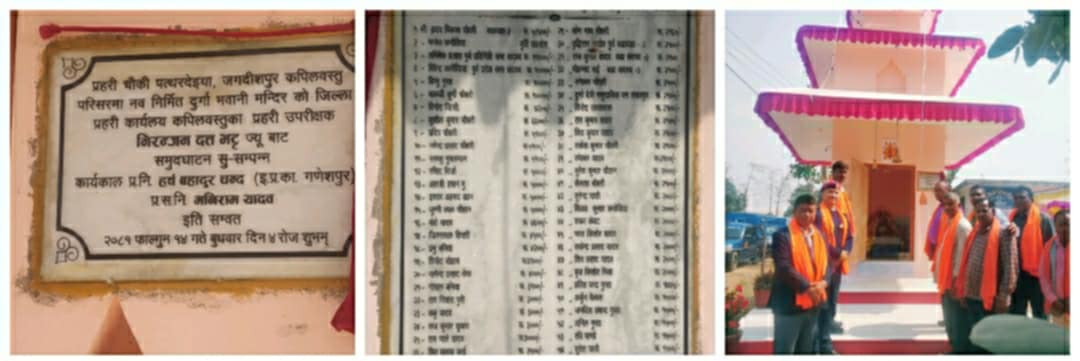 कपिलवस्तु जिल्लाको विजयनगर गाउँपालिका वडा नं ४ मा रहेको प्रहरी चौकी पत्थरदेइयामा नव निर्मित दुर्गा भवानीको मन्दिर आज जिल्ला प्रहरी कार्यालय कपिलवस्तुका प्रहरी उपरीक्षक निरन्जन दत्त भट्ट द्वारा समुद्घाटन गरिएको छ।